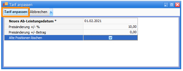 In den Vorgaben > Abrechnung > Tarife wurde in der Liste und in den Tarifdetails eine neue Funktion Tarif anpassen eingefügt. Hiermit können alle Preise des Tarifs um einen %-Wert oder einen Betrag, gesammelt, geändert werden. Gleichzeitig kann das Ab-Leistungsdatum neu gesetzt werden.