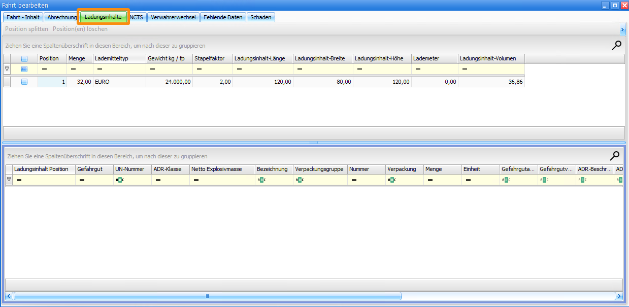 US#: 177526 Im cs PLAN im Fenster Fahrt bearbeiten wird nun auch der Reiter Ladungsinhalte angezeigt, in dem man bei Bedarf die Informationen zum Ladungsinhalt ändern kann.