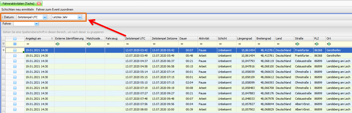 Die Fahreraktivitäten werden als Übersicht angezeigt.
