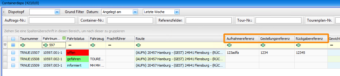 In cs PLAN in den Fenstern Alle Fahrten und Containerdispo wurden drei weitere Spalten ergänzt: