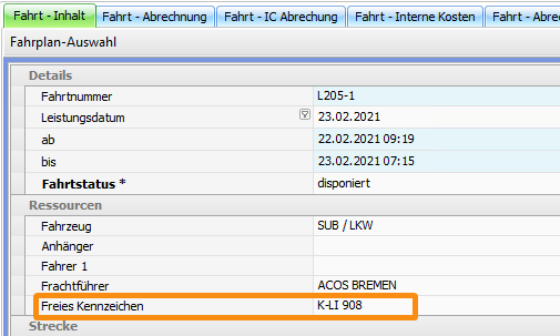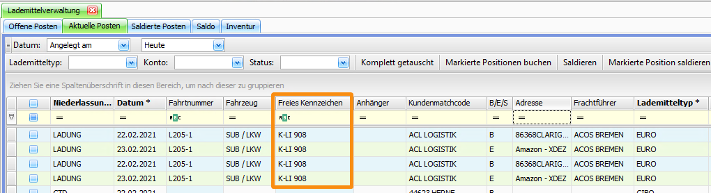 US#: 175218 Im Menü Auftrag > Lademittelverwaltung > Aktuelle Posten wurde die Spalte Freies Kennzeichen ergänzt. Wurde in der Fahrt ein freies Kennzeichen erfasst, wird es dann hier bei Aktuelle Posten ebenfalls angezeigt.