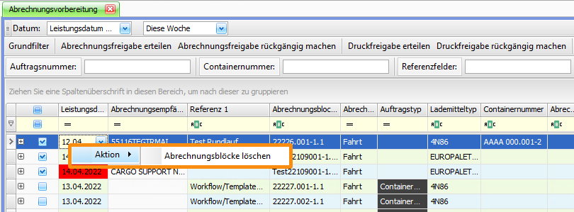In der Abrechnung > Abrechnungsvorbereitung können nun mehrere Abrechnungsblöcke gesammelt gelöscht werden. Durch Anhaken der Abrechnungsblöcke und Rechte-Maus Aktion > Abrechnungsblöcke löschen werden die gewählten Blöcke gleichzeitig gelöscht.