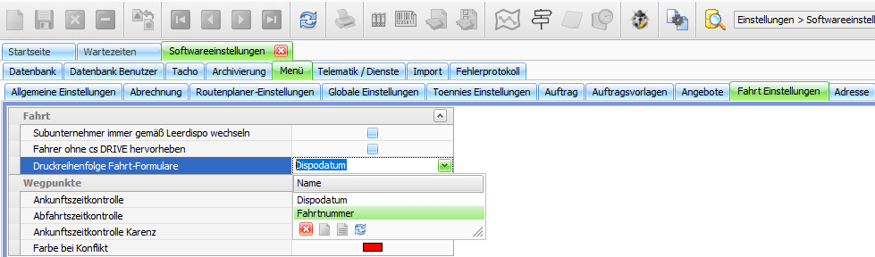 In cs JOB kann jetzt unter Einstellungen > Softwareeinstellungen > Menü > Fahrt Einstellungen festgelegt werden, in welcher Reihenfolge Fahrt-Formulare aus cs PLAN heraus gedruckt werden sollen.
