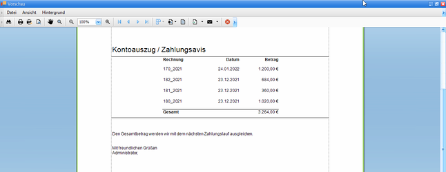 Nach Druck öffnet sich der Kontoauszug / Zahlungsavis. Diesen können unsere Kund*innen ihren Auftraggeber*innen zukommen lassen. Dies dient quasi als Vorab-Information, dass die gestellten Rechnungen ausgeglichen werden.