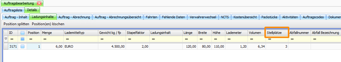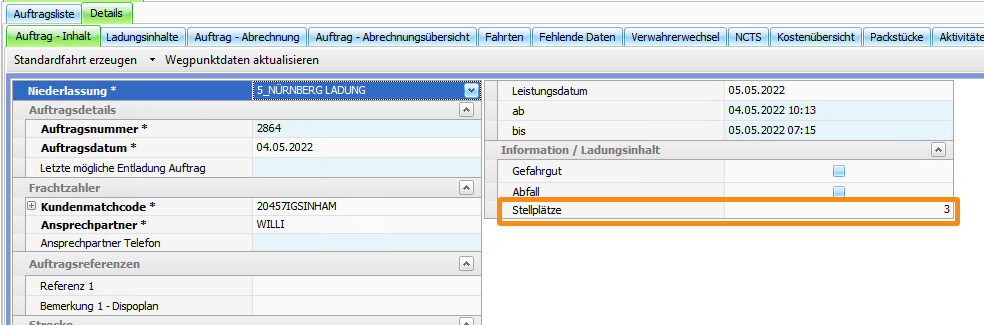 Die Stellplätze im Auftragskopf werden nicht automatisch aus den Ladungsinhalten aufsummiert. Das Füllen erfolgt lediglich über die Schnittstelle.