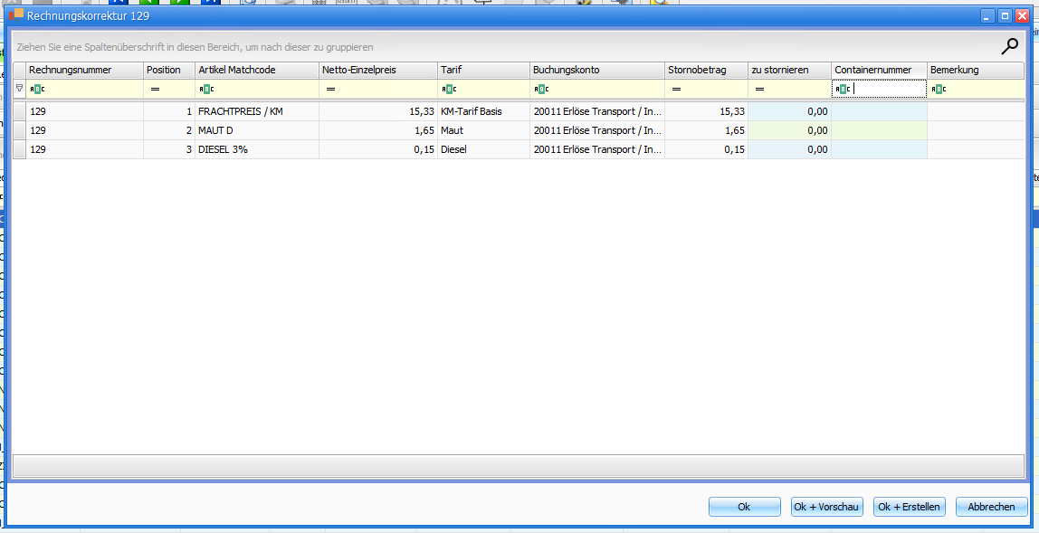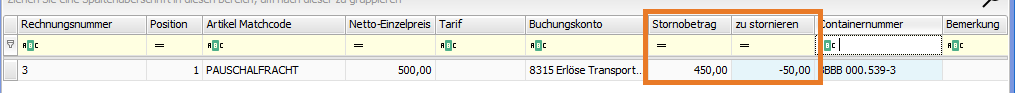 In diesem Beispiel wurde dem Kunden eine Rechnung über eine Pauschalfracht in Höhe von 500,- € erstellt. Dieser hat der Kunde reklamiert, da die vereinbarte Fracht 450,- € waren. Somit wird der tatsächliche Wert in das Feld Stornobetrag eingetragen und das System errechnet die Differenz (zu stornieren) für den Korrekturbeleg.