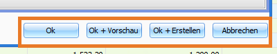 - Ok + Vorschau: Ergänzend zu den Schritten aus Ok, wird noch die Vorschau des neuen Beleges angezeigt.