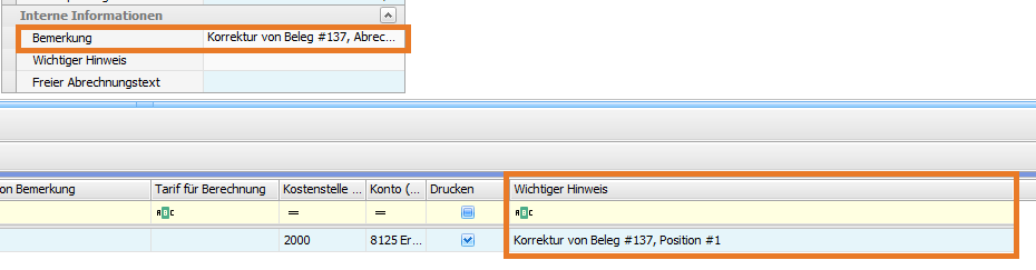 In der Position des Artikels wird in dem Feld Wichtiger Hinweis ebenfalls eine ergänzende Information eingetragen: "Korrektur von Beleg #137, Position #1".