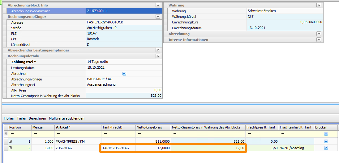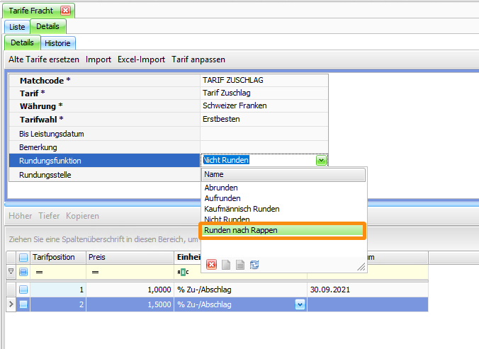 In den Vorgaben > Abrechnung > Tarife Fracht > Details wurde bei der Rundungsfunktion eine neue Auswahl Runden nach Rappen ergänzt.