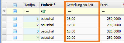 In dem Menüpunkt Vorgaben > Abrechnung > Tarife Fracht > Details gibt es eine neue Spalte: Gestellung bis Zeit.