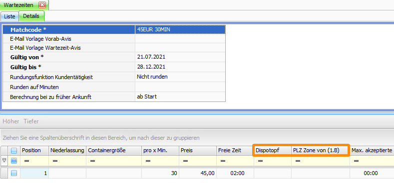 In den Vorgaben > Auftrag > Wartezeiten > Details wurden im unteren Bereich zwei neue Spalten Dispotopf und PLZ Zone von (1.B) eingefügt. Diese Informationen werden immer mit den jeweiligen Fahrtdaten abgeglichen. US# 189437