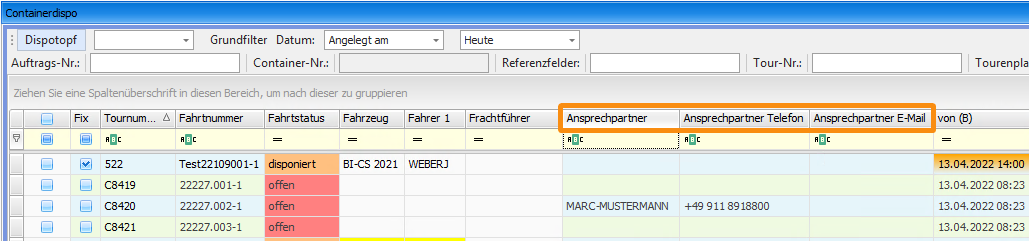In cs PLAN in den Fenstern Alle Fahrten und Containerdispo wurden weitere Spalten ergänzt, die Informationen aus dem Auftrag anzeigen: Ansprechpartner Ansprechpartner Telefon Ansprechpartner E-Mail US#: 197899