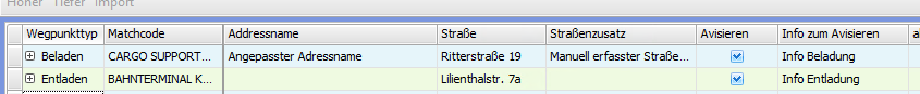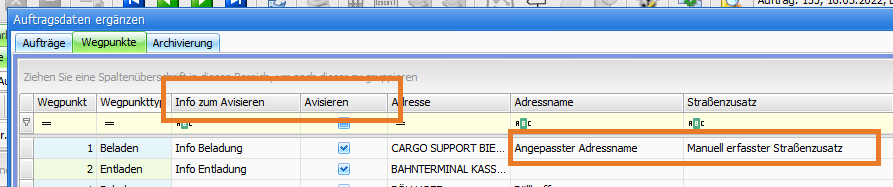 In den Wegpunkten sind 2 Avisierungsspalten hinzugekommen und die Felder Adressname und Straßenzusatz sind editierbar gemacht worden: