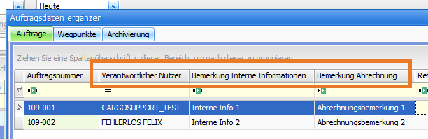 Die Funktion Auftragsdaten ergänzen wird über die rechte Maustaste in der Auftragsliste aufgerufen. Hier können drei neu angebundene Spalten im Reiter Aufträge gefüllt werden.