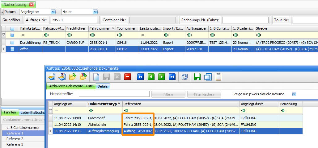 In der Auftrag > Nacherfassung wurde die Anzeige der archivierten Dokumente so erweitert, dass hier alle Dokumente von Fahrt und Auftrag ' angezeigt werden. Das heißt, dass hier auf Fahrt-Ebene auch Auftragsdokumente angezeigt werden.