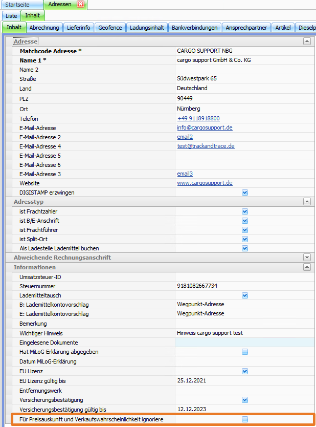 Wenn bestimmte Frachtführer für die Preisauskunft nicht berücksichtigt werden sollen, so kann in cs JOB unter Stammdaten > Adressen > Inhalt über das Setzen des Hakens bei Für Preisauskunft und Verkaufswahrscheinlichkeit ignorieren diese Adresse ausgeschlossen werden. Somit werden alle vergangenen Fahrten, die mit dieser Adresse als Frachtführer durchgeführt wurden in der Preisauskunft ignoriert und nicht angezeigt.