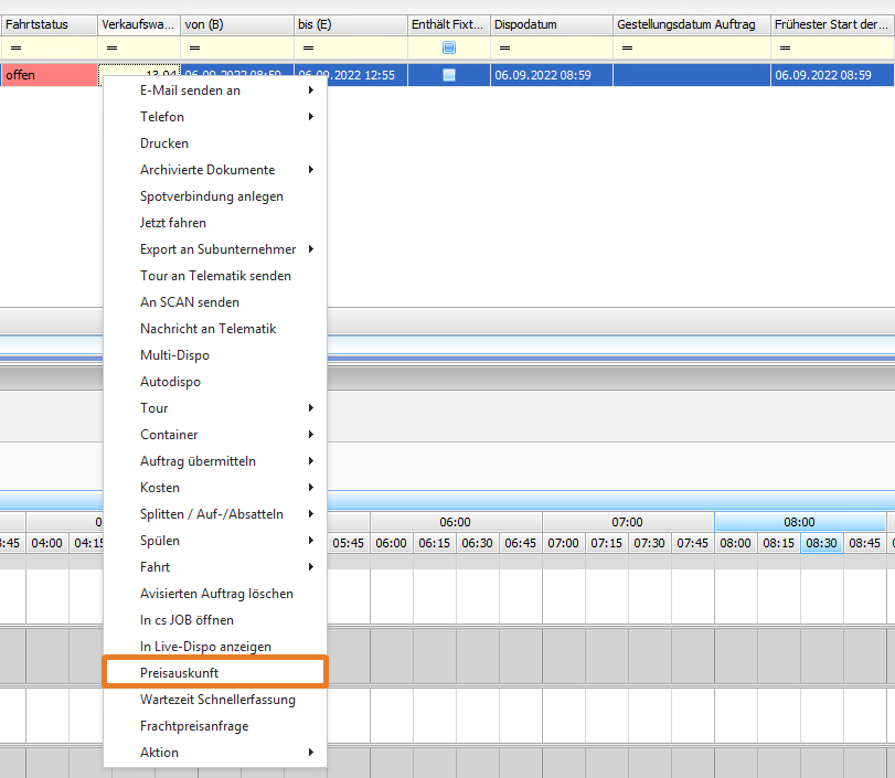 In cs PLAN wurde in den Listenansichten im Rechtemaustastenmenü ein neuer Menüpunkt Preisauskunft eingefügt. Dafür wird zunächst die gewünschte Fahrt markiert und der Menüpunkt Preisauskunft per Klick ausgewählt.