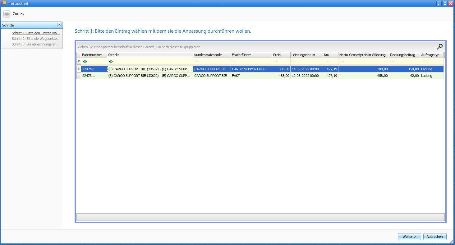 Es öffnet sich damit ein schwebendes Fenster. Es werden alle Fahrten aufgeführt, die innerhalb der letzten 6 Monate durchgeführt wurden, einen Frachtführer eingetragen haben und die gleichen Adressen beinhalten wie die markierte Fahrt. Des Weiteren werden folgende Informationen zu den vergangenen Fahrten gezeigt: Fahrtnummer, Strecke, Kundenmatchcode, Frachtführer, Preis, Leistungsdatum, km, Netto-Gesamtpreis, Deckungsbeitrag und Auftragstyp.