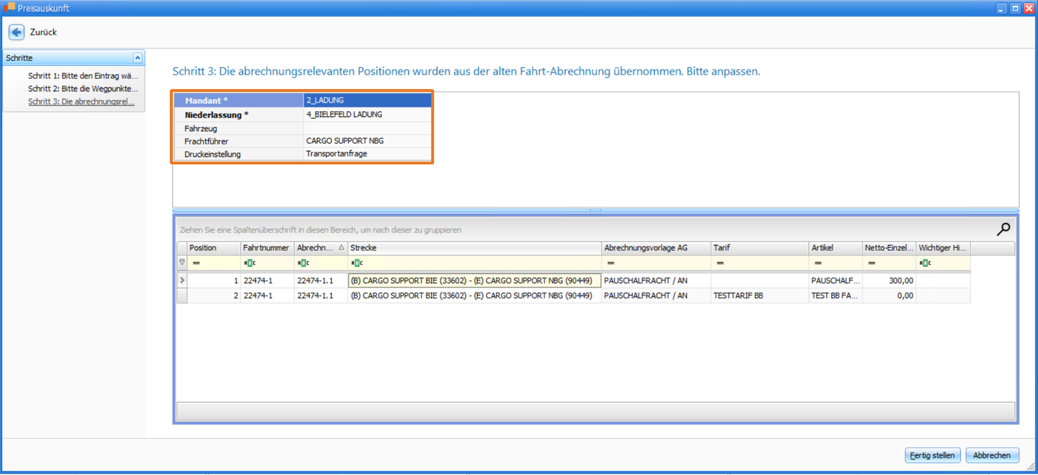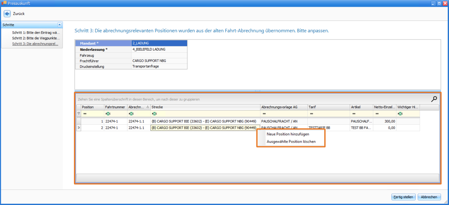 Im unteren Bereich des Fensters werden die fahrtseitigen Abrechnungsdaten dargestellt. Auch diese Daten stammen aus der Übernahme aus Schritt 1. Die Abrechnungspositionen können entsprechend editiert werden. Des Weiteren besteht die Möglichkeit, Abrechnungspositionen über rechte Maustaste zu entfernen oder hinzuzufügen.