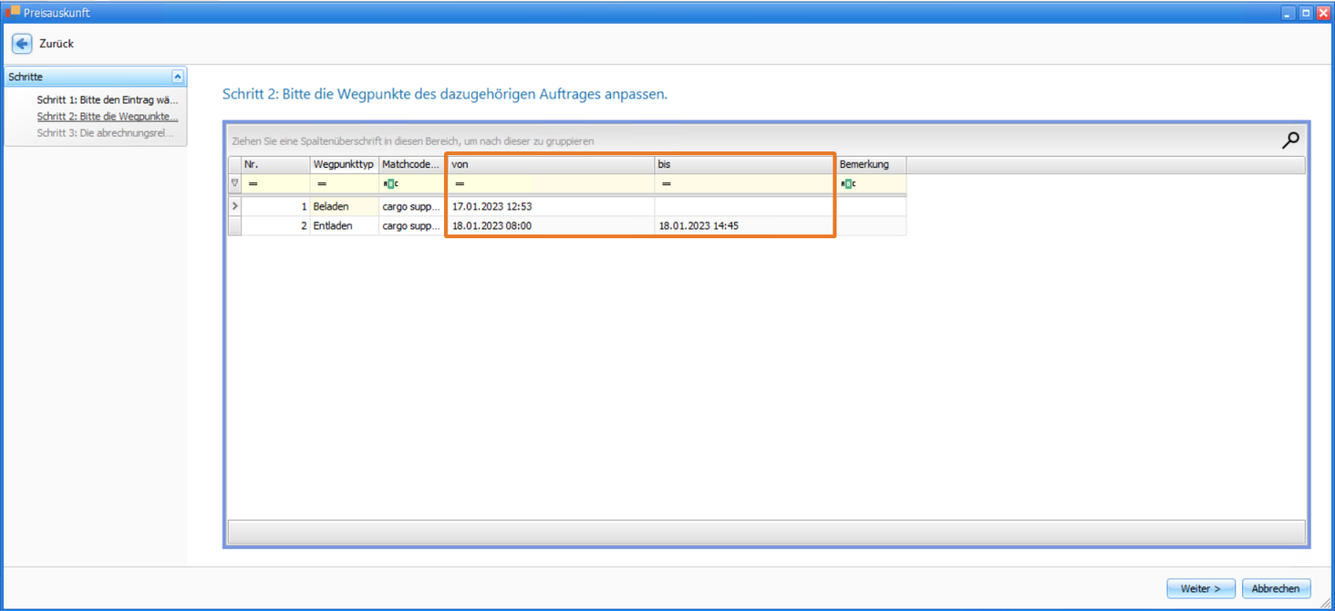 An dieser Stelle besteht die Möglichkeit, die von / bis Zeiten der Fahrt anzupassen. Über die Schaltfläche Weiter geht es dann zum dritten und abschließenden Schritt.