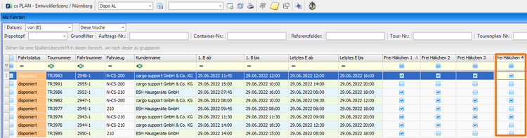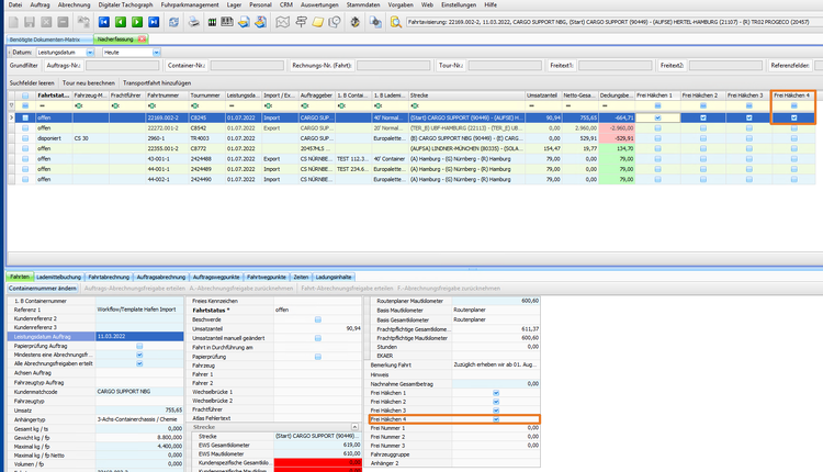 Im Fahrtinhalt ist neben den bereits bestehenden Häkchenfeldern Frei Häkchen 1, 2 und 3 ein weiteres frei belegbares Häckchenfeld Frei Häkchen 4 hinzugekommen. Dieses wird in den Dispoplanfenstern Alle Fahrten und Containerdispo angezeigt.