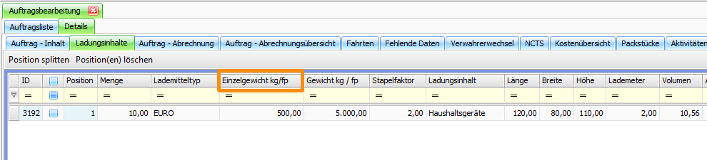 Unter Auftrag > Auftragsbearbeitung > Auftrag Details wurde im Reiter Ladungsinhalte eine neue Spalte Einzelgewicht kg/fp ergänzt. Das Einzelgewicht kann statt dem Gesamtgewicht eingesetzt werden.