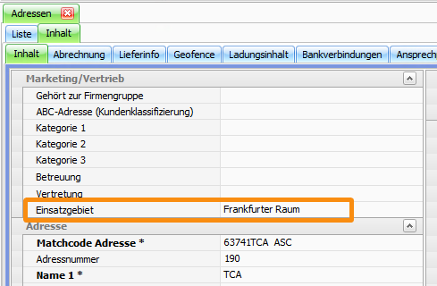 Ist in den Stammdaten > Adressen > Inhalt unter der Kategorie Marketing/Vertrieb im Feld Einsatzgebiet eine Information erfasst, wird diese dann in cs PLAN in den genannten Fenstern angezeigt.