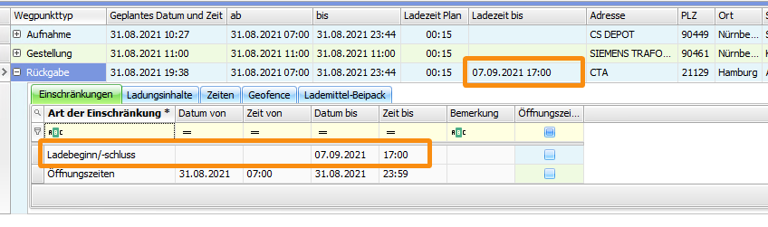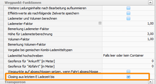 Im Menü Einstellungen > Mandanten > Details > Einstellungen in der Kategorie Wegpunkt-Funktionen wird die Funktion im Feld Closing aus letztem E Ladezeit bis aktiviert.