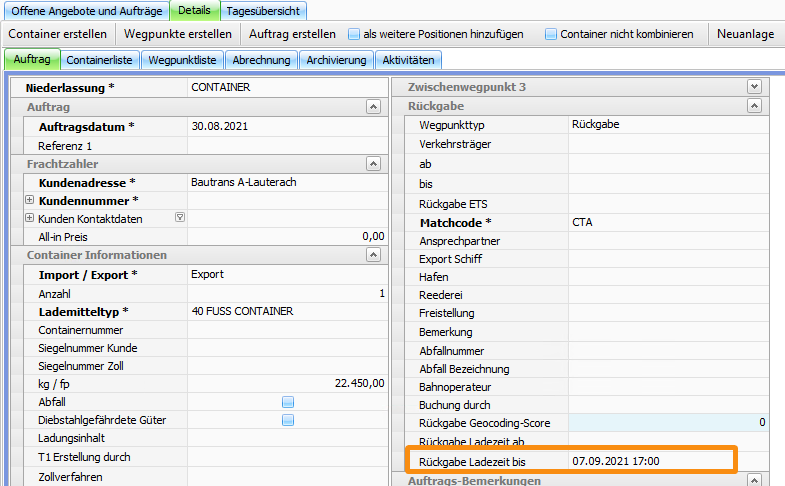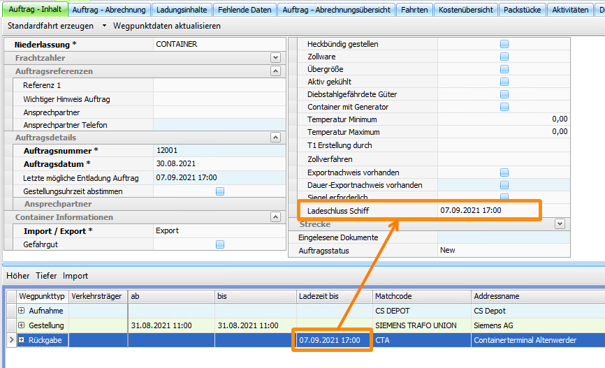 Unter Auftrag > Auftragsneuerfassung Container wurde eine einstellbare Funktion zum Füllen des Feldes Ladeschluss Schiff des Auftrags integriert. Ist die Funktion aktiviert (siehe Einstellungen), wird das Feld Ladeschluss Schiff im erzeugten Auftrag automatisch aus dem Wegpunkt "Rückgabe" mit Datum / Uhrzeit des Feldes Rückgabe Ladezeit bis gefüllt.