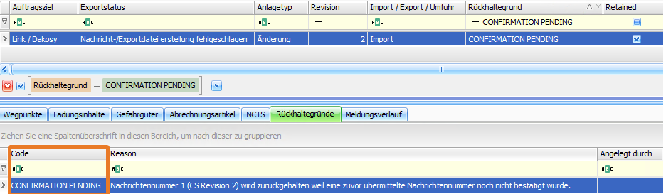 CONFIRMATION PENDING Nur bei der Schnittstelle Link / Dakosy: Eine Nachrichtennummer wird zurückgehalten, weil eine zuvor übermittelte Nachrichtennummer noch nicht bestätigt wurde und / oder es wird eine neue Revision mit Revisionsnummer > 1 exportiert.