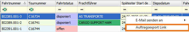 Unabhängig davon, wie viele Fahrten zeitgleich gesendet werden sollen, wird anschließend über das Rechtsklick-Menü auf Auftragsexport Link geklickt, um die Fahrt(en) abzuschicken.