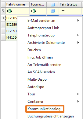 Bei Rechtsklick auf eine Fahrt in cs PLAN ist unter anderem auch das Kommunikationslog im Menü auswählbar.