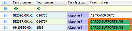 In cs PLAN kann in das Feld Frachtführer der jeweilige Partner eingetragen werden, zu dem ein Auftrag exportiert werden soll. Ist der Partner für den Export vorgesehen, färbt sich das Feld Frachtführer grün.