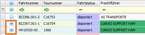Sollen mehrere Fahrten gleichzeitig verschickt werden, müssen diese zunächst markiert markiert werden, nachdem ein Frachtführer eingetragen wurde.