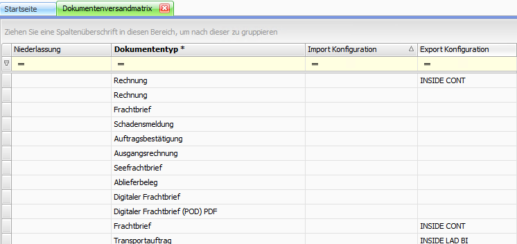 Unter Vorgaben > Schnittstellen > Dokumentenversandmatrix kann festgelegt werden, bei welcher Import- und Exportkonfiguration welche Dokumententypen mitgeschickt werden sollen.