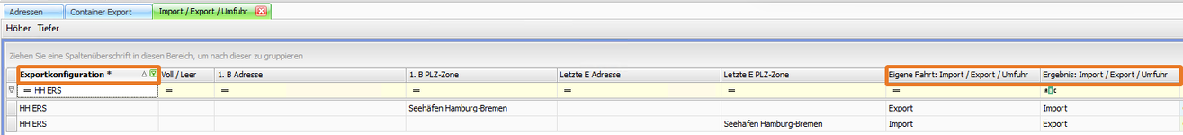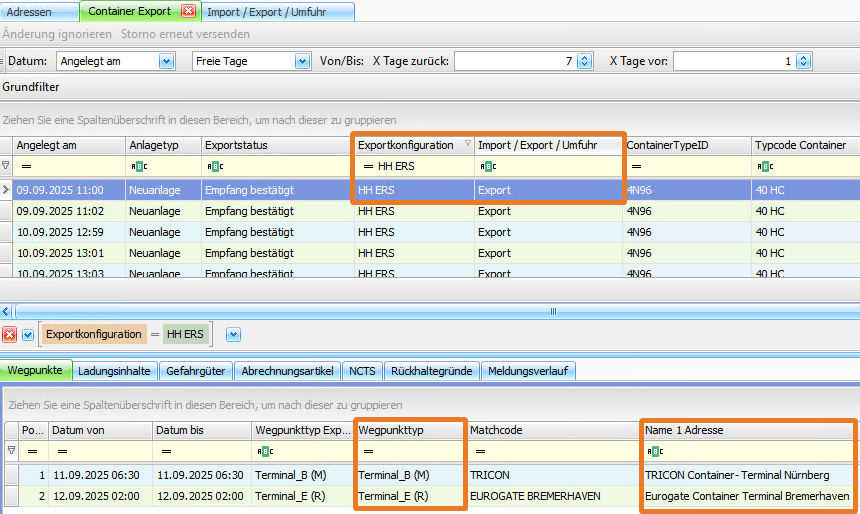 Wenn alle Kriterien einer Zeile aus dem Reiter Import / Export / Umfuhr zutreffen, wird in der Container Export Liste die Perspektive des Kunden angezeigt.