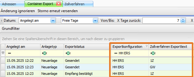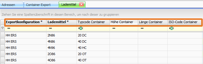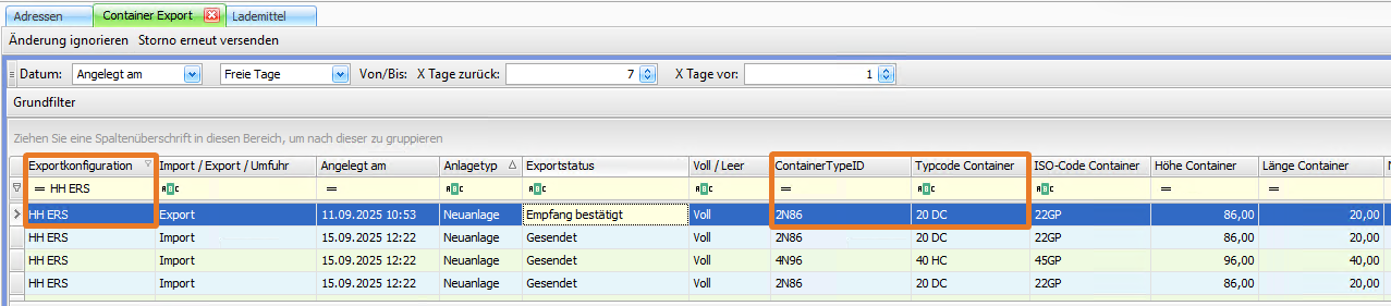 Die hinterlegten Daten aus dem Reiter Lademittel werden in die Übertragungsdatei übernommen und sind auch in der Container Export Liste zu sehen.