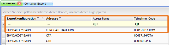 Der Inhalt aus dem Feld Adress Name wird in der Container Export Liste im Reiter Wegpunkte unter Matchcode übernommen. Wenn in den Vorgaben das Feld Teilnehmer Code gefüllt ist, wird der Inhalt in das Feld Teilnehmercode Adresse geschrieben.