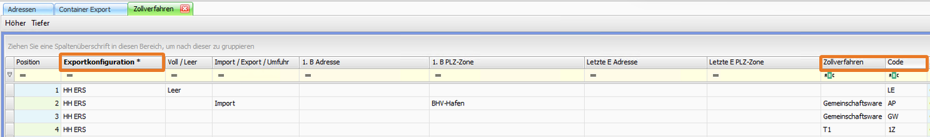Der Inhalt aus dem Feld Code wird in der Container Export Liste in das Feld Zollverfahren Exporttext geschrieben und damit auch an die Empfängerseite übermittelt.