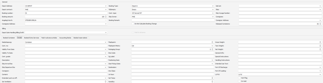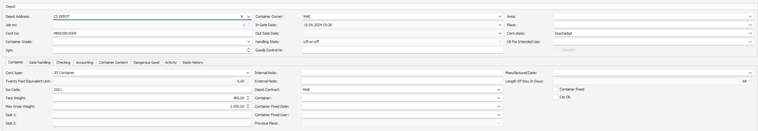 Hier wird im Tab Container alle Details angezeigt, die an Informationen zu dem Container bisher erfasst wurden.