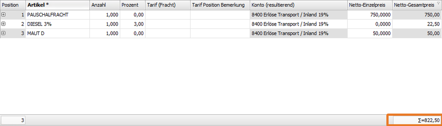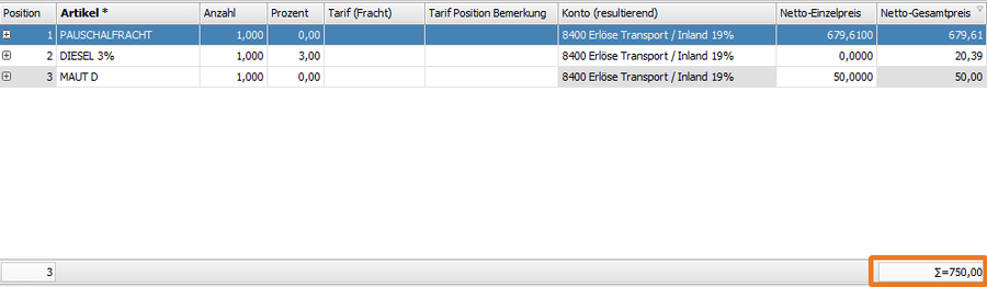 - Im Beispiel wird der Wert im Artikel PAUSCHALFRACHT und DIESEL 3 % automatisch so angepasst, dass der gewünschte Netto-Gesamtbetrag „750,00 Euro“ erzielt wird. Der Artikel MAUT D bleibt unverändert.