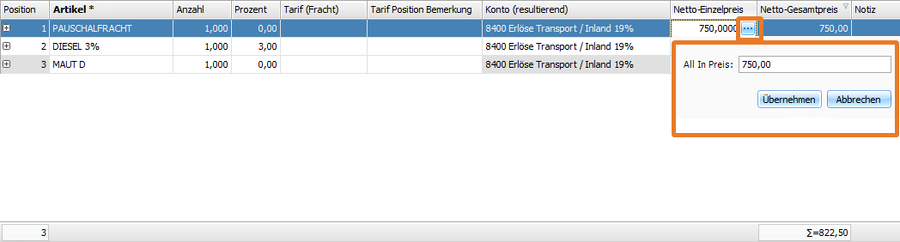 - Klicken Sie im Abrechnungsartikel PAUSCHALFRACHT mit der Maus in das Feld Netto-Einzelpreis und rechts auf das erweiterte Auswahlzeichen.• Geben Sie in dem neuen Fenster All in Preis den gewünschten Gesamtbetrag ein und übernehmen Sie diesen durch einen Klick auf Übernehmen oder mit Enter.