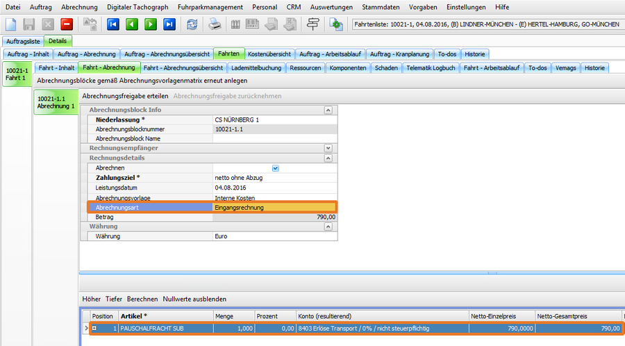- Abrechnungs-Artikel Pauschalftracht auswählen und Preis von 790,00 Euro erfassen